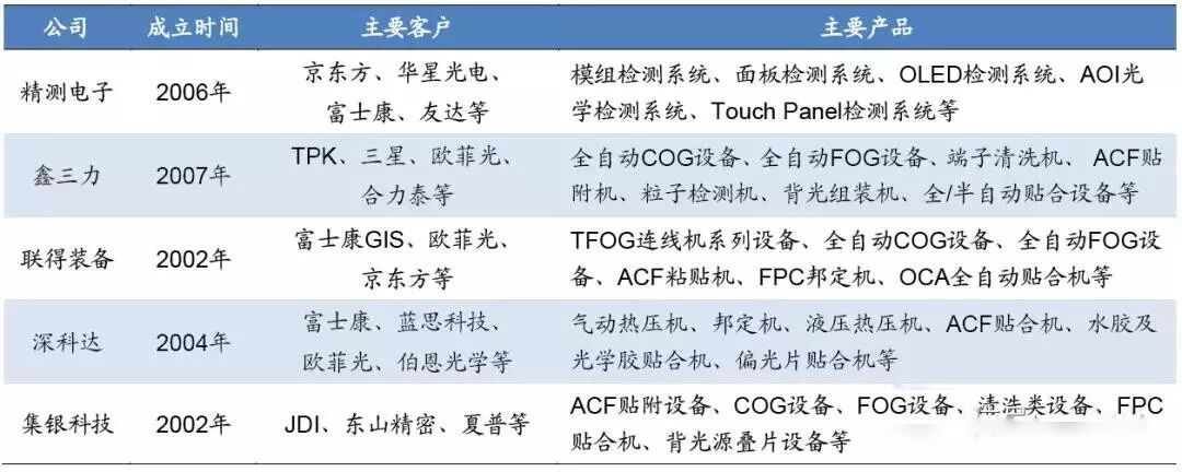 目前大陆面板设备厂商发展较快的企业包括:专注面板设备检测国内龙头精测电子,以及在后段模组制程设备的主要供应商鑫三力(智云股份子公司)、联得装备、深科达及集银科技(正业科技子公司)、太原风华(未上市)等几家厂商。