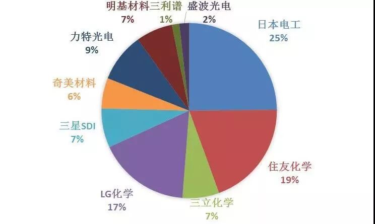偏光片市场主要被日韩企业垄断,韩国LG 化学占市场份额27%,日本东电工占26%,住友化学占24%。