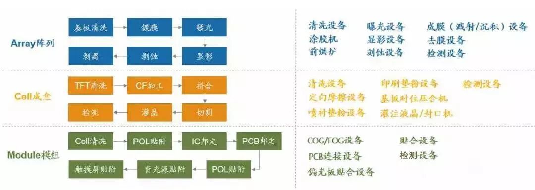 台湾面板设备厂商主要专注LCD面板后段制程设备及检测设备。LCD液晶面板制造主要分为三段,前段Array阵列制程、中端Cell成盒制程以及后段Module模组制程。